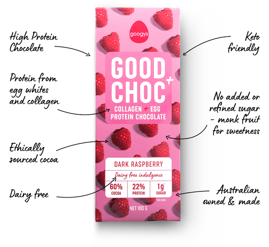 Googy's Good Choc+ 100g, Dark Raspberry