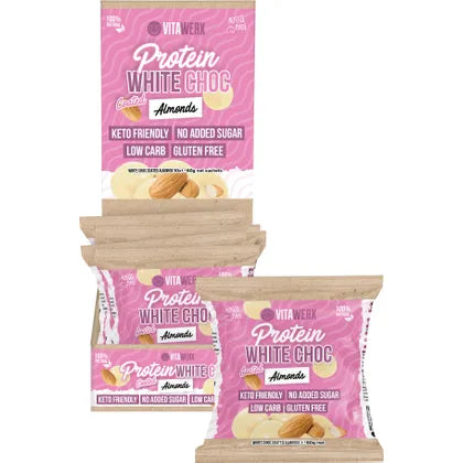 Vitawerx Protein White Chocolate Coated Almonds Single 60g Or A Box of 10, Rich Chocolate With A Creamy Taste
