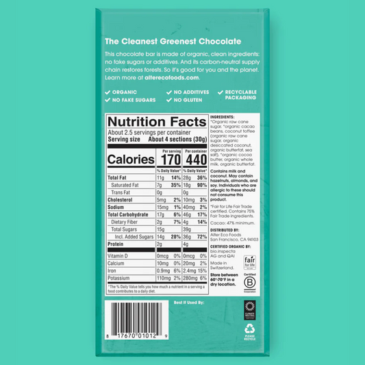 Alter Eco Chocolate 80g, Dark Salted Coconut Toffee Flavour 47% Cacao, Certified Organic