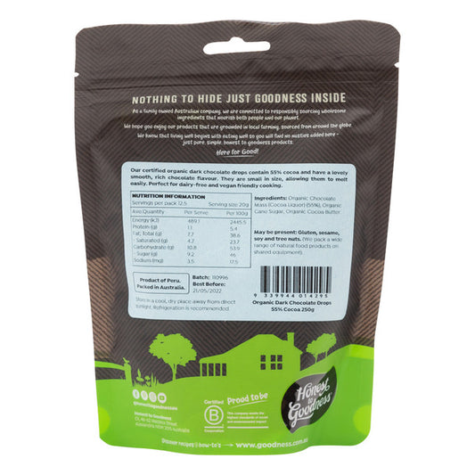 Honest To Goodness Dark Chocolate Drops 55% Cocoa 250g, Australian Certified Organic