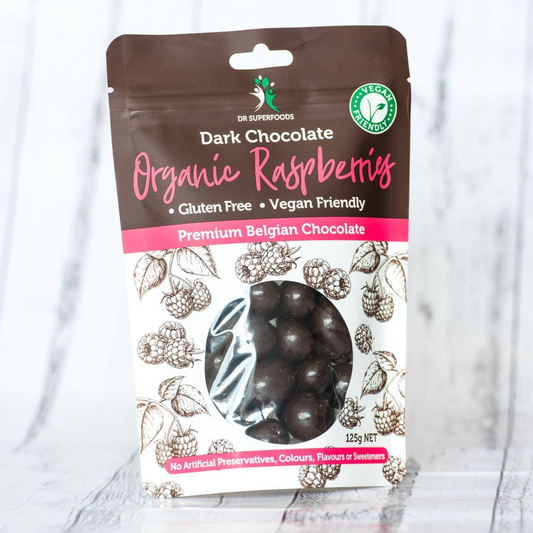 Dr Superfoods Dark Chocolate Coated Raspberries 125g, Premium Belgian Dark Chocolate