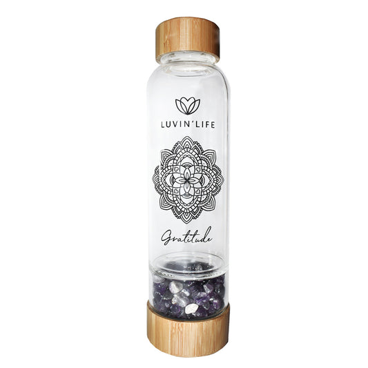 Luvin' Life Water Bottle 550ml, Amethyst Crystals & Bamboo 'Gratitude' {Includes A Grey Sleeve}