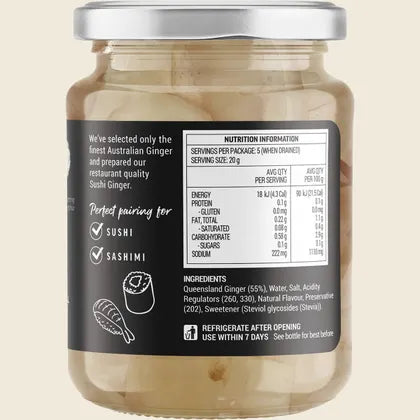 Buderim Australian Sushi Ginger 200g offers a perfectly balanced accompaniment to sushi, sashimi, and Asian-inspired dishes. Made with 55% fresh ginger juice, this locally crafted sushi ginger delivers a gentle heat and refreshing bite without added sugar or artificial colours.