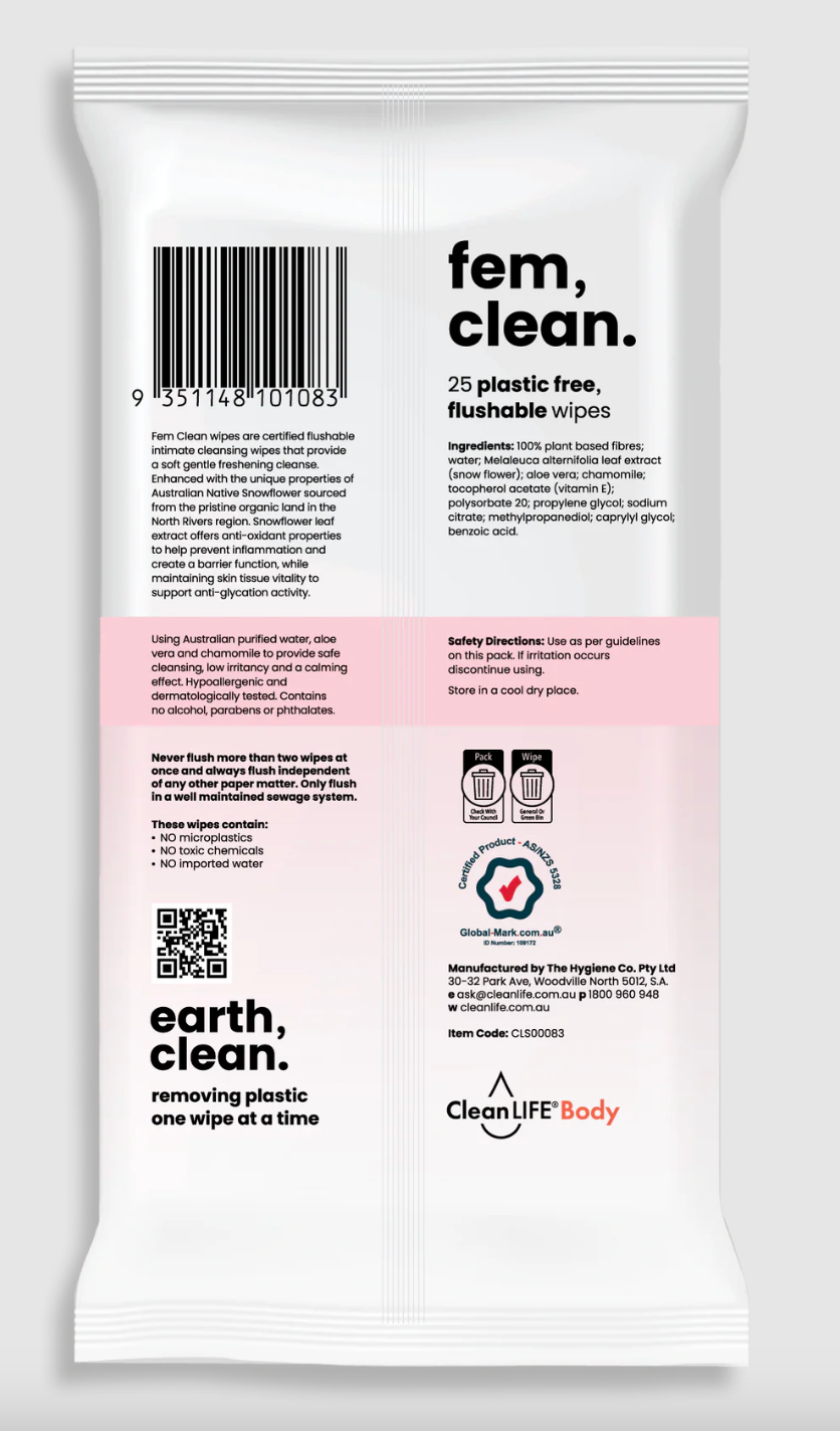 Fem Clean Wipes are certified flushable intimate cleansing wipes that provide a soft gentle freshening cleanse. Enhanced with the unique properties of Australian Native Snowflower sourced from the pristine organic land in the North River region. Snowflower leaf extract offers anti-oxidant properties to help prevent inflammation and create a barrier function, while maintaining skin tissue vitality to support anti-glycation activity.