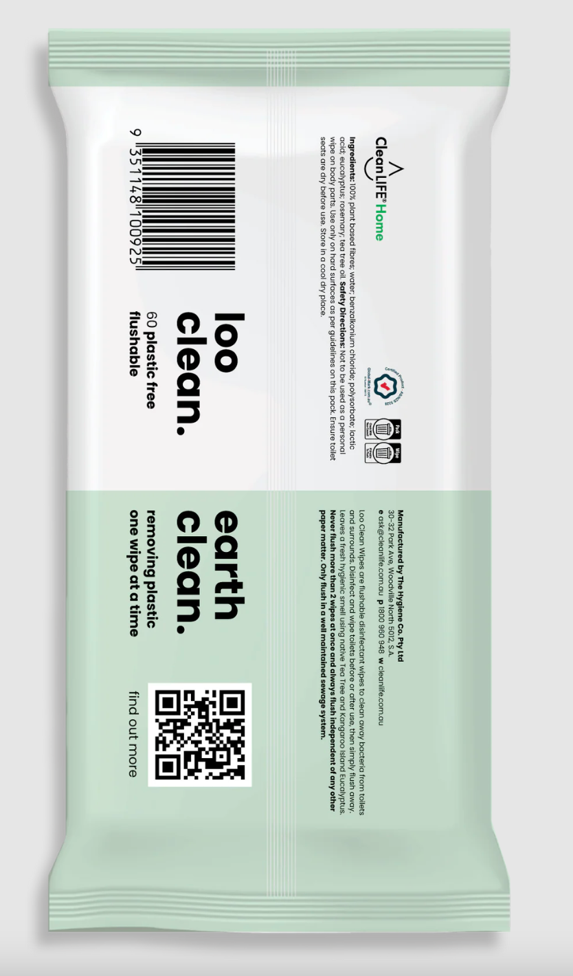 Loo Clean Wipes are flushable disinfectant wipes to clean away bacteria from toilets and surrounds. Leaves a fresh hygienic smell using native Tea Tree and Kangaroo Island Eucalyptus