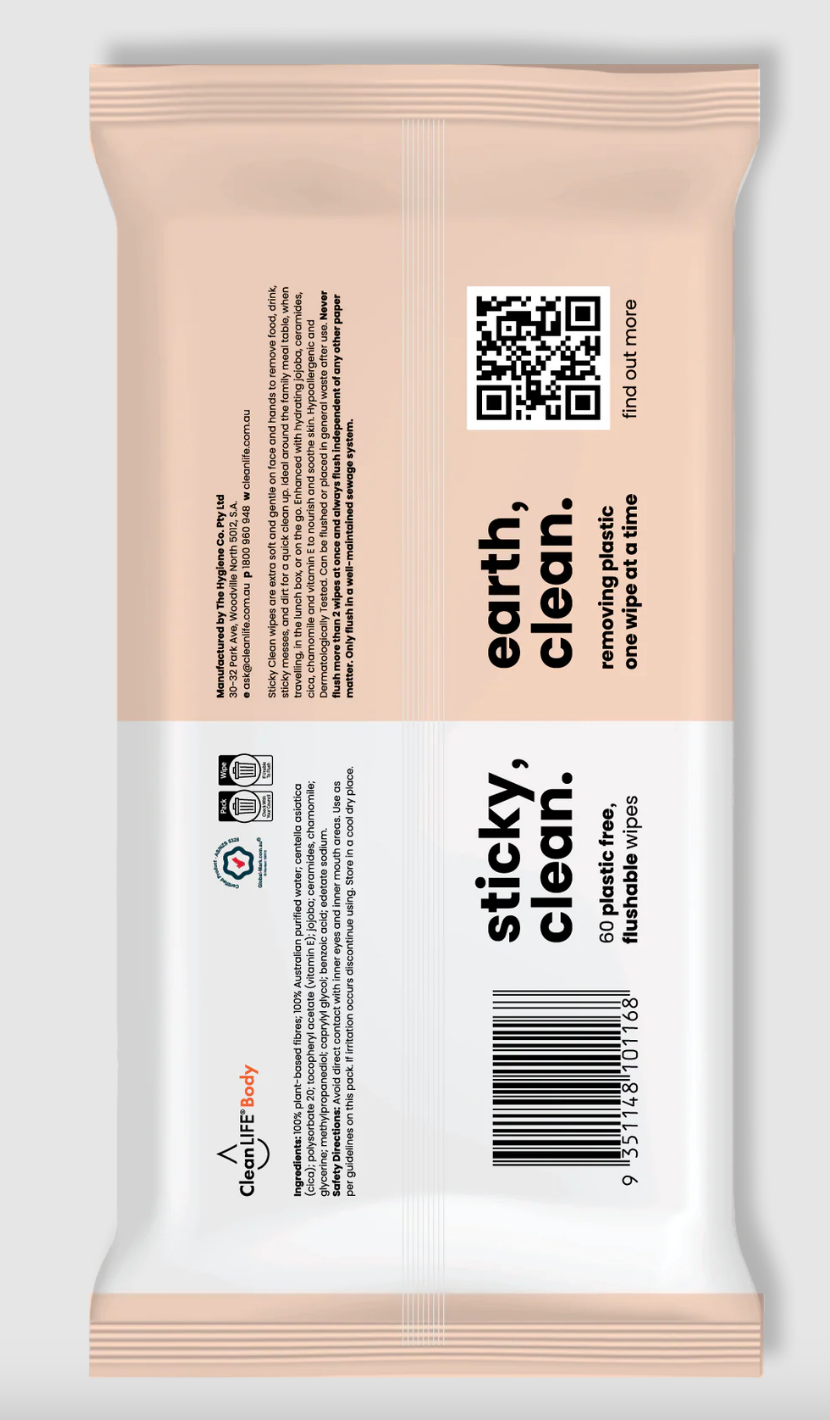 Our Sticky Clean Wipes are made from high-quality, Australian-sourced ingredients, carefully filtered and purified for your skin's health. Sticky clean wipes are perfect for sensitive skin, offering gentle cleansing and hydration while helping to protect and nourish. Use them to tackle small sticky messes, remove food, drink, and dirt. Keep a pack in your bag, car, or take them when you are travelling for a quick, easy, convenient cleanup whenever you need it.