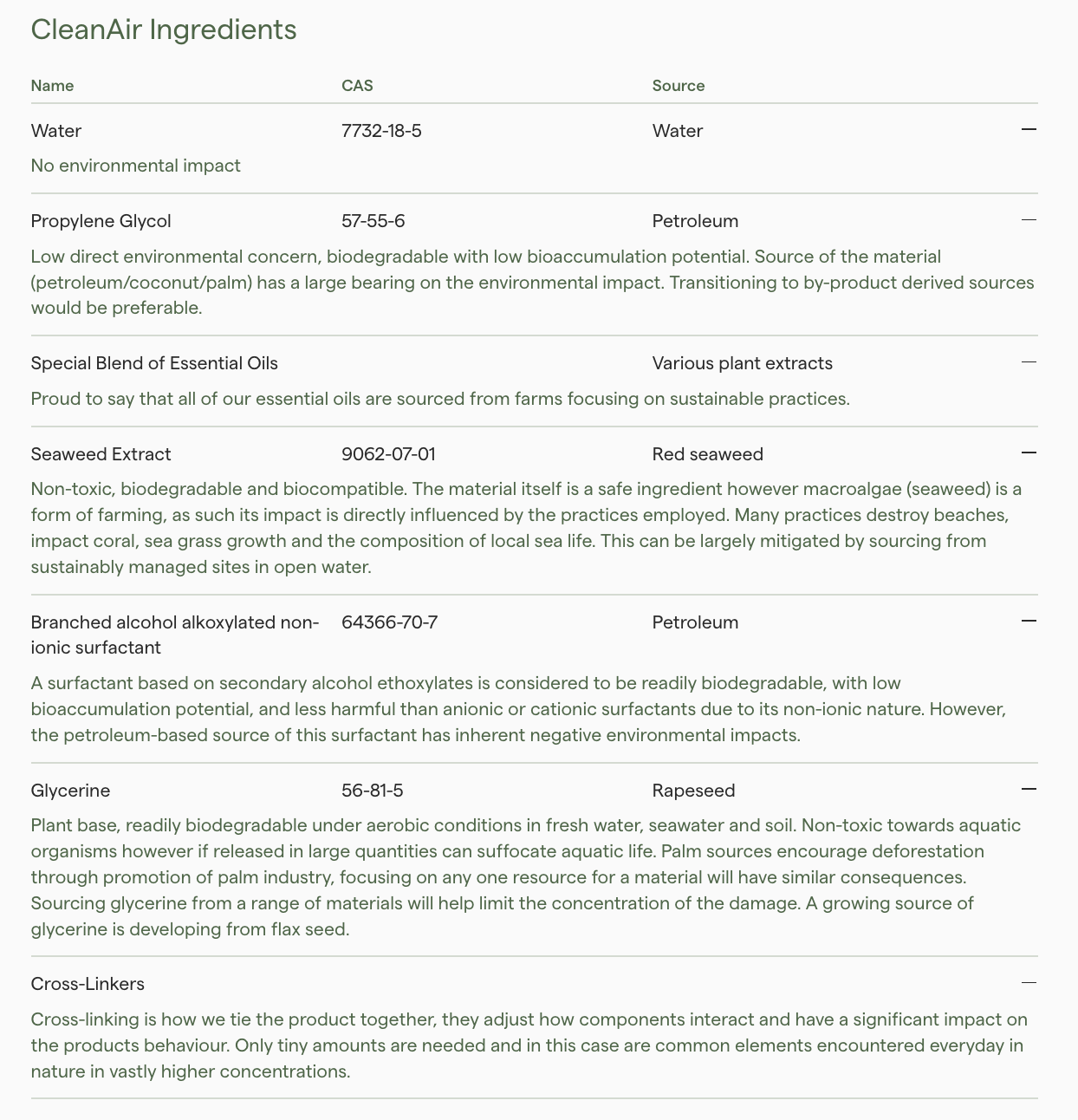 Water, Propylene glycol, Essential Oil Blend (Derived from various plant extracts), Red Seaweed Extract, Branched alcohol alkoxylated non-ionic surfactant, Glycerine, Cross-linkers.