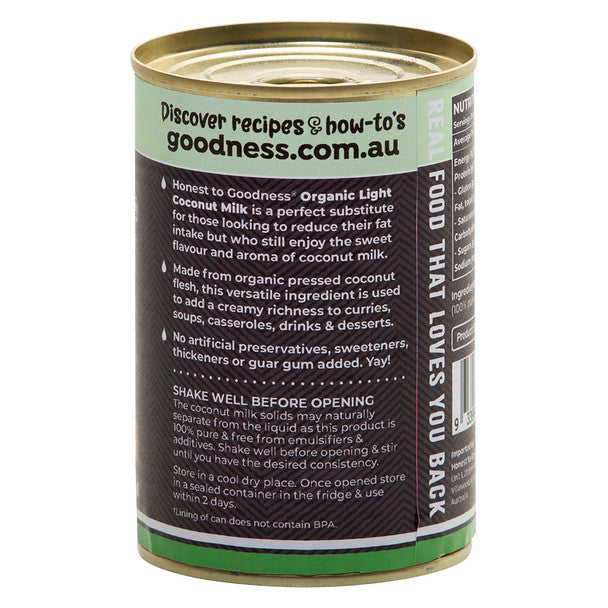 Honest To Goodness Certified Organic Organic Light Coconut Milk 400mL, No Added Thickeners