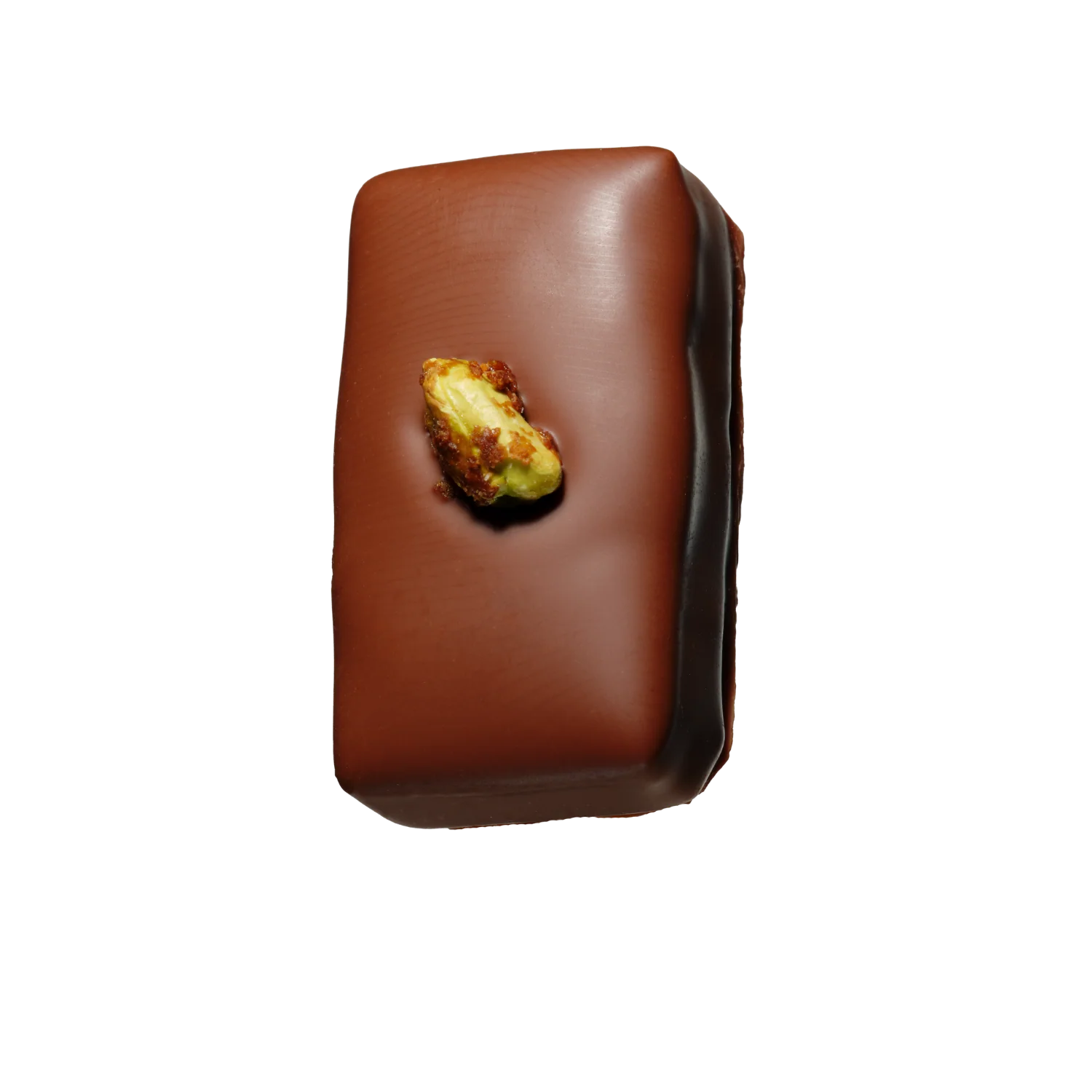 Silky pistachio ganache dotted with lightly caramelised pistachio pieces, wrapped in creamy mylk chocolate. Smooth yet crunchy, naturally sweet, and finished with tremella mushroom for a luxe, melt-in-the-mouth bite.