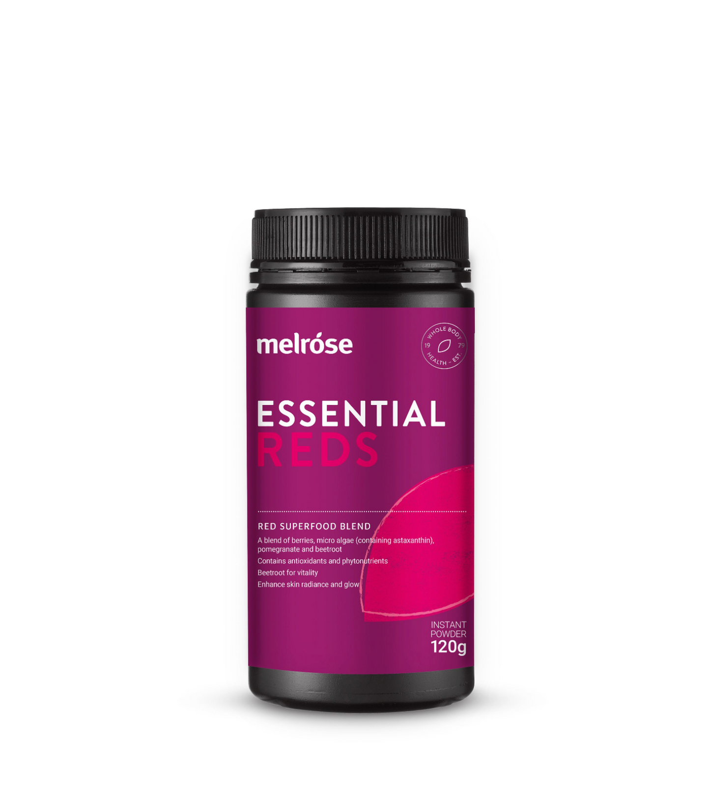 Melrose Essential Reds is a vital combination of superfoods that helps balance the daily stressors on our bodies allowing you to function at an elevated level. Contains astaxanthin from micro algae known to be one of the most powerful antioxidants in nature. It promotes healthy skin and vitality from the inside out. Combined with nutrient-rich berry blend and pomegranate high in plant polyphenols. Also contains nitrate-rich beetroot, which contributes to healthy blood flow and energy. Source of antioxidants and phytonutrients. Boosts daily energy and vitality. Enhance healthy, glowing skin. Vibrant and refreshing blend of red superfoods.