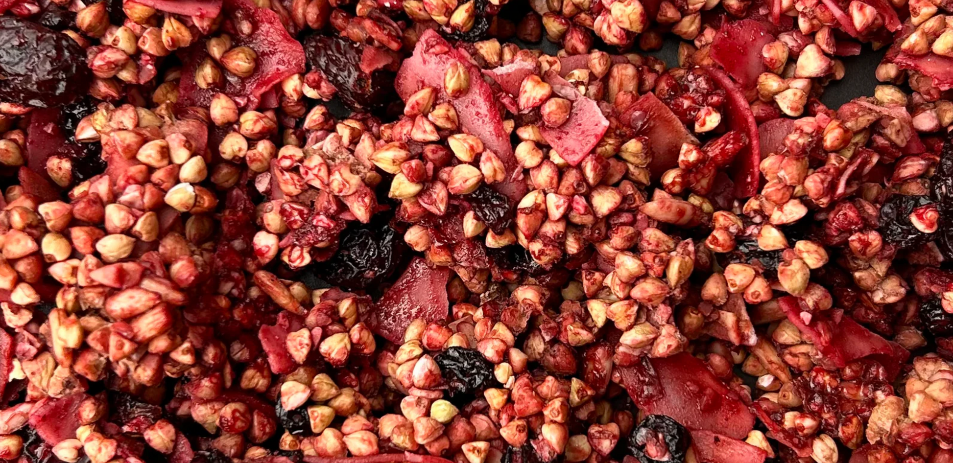 Activated buckwheat kernels* (activated in kombucha filtered water, Australian rock salt), evaporated coconut nectar*, coconut chips*, coconut milk powder, currants, cranberries*, beetroot powder*, blueberry juice powder*.