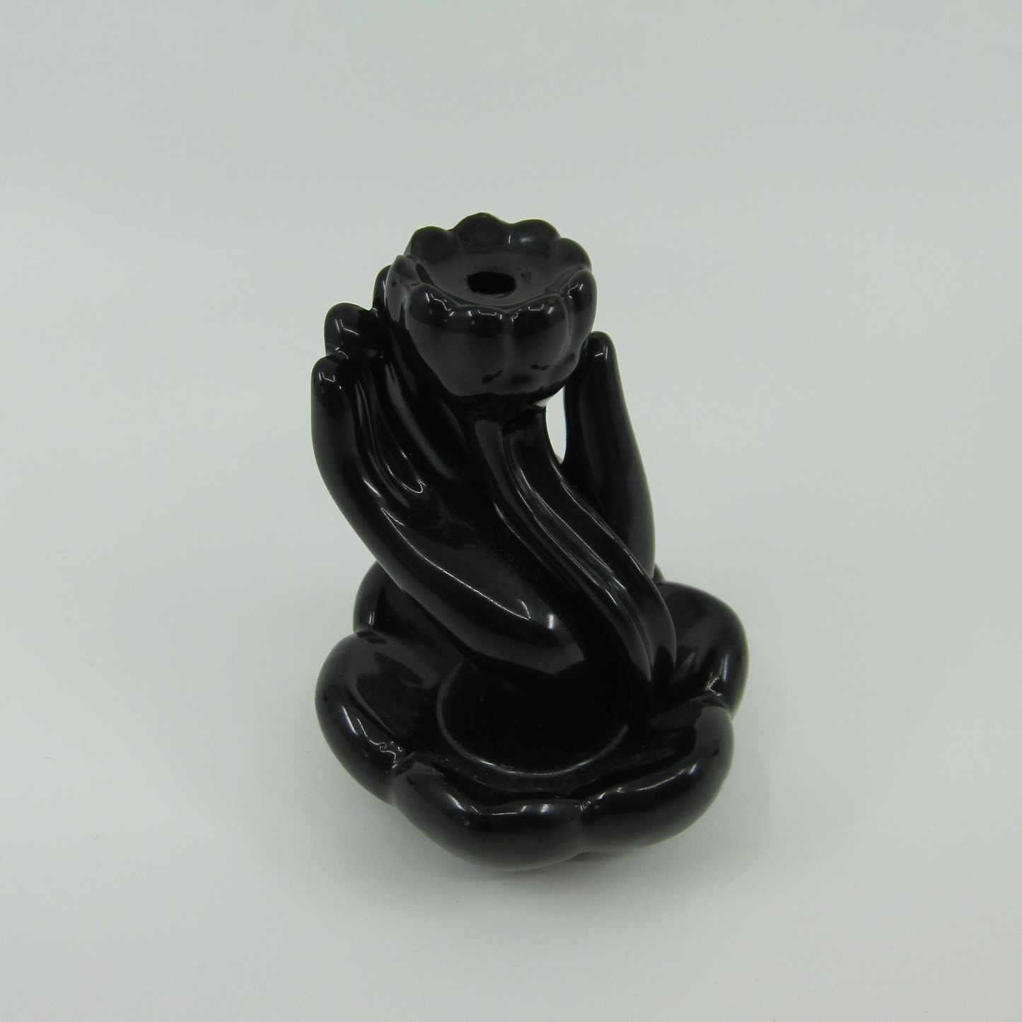 Glossy black lotus in hand. Lotus shaped pool at the bottom. Use with backflow cones in a still room for best effect.