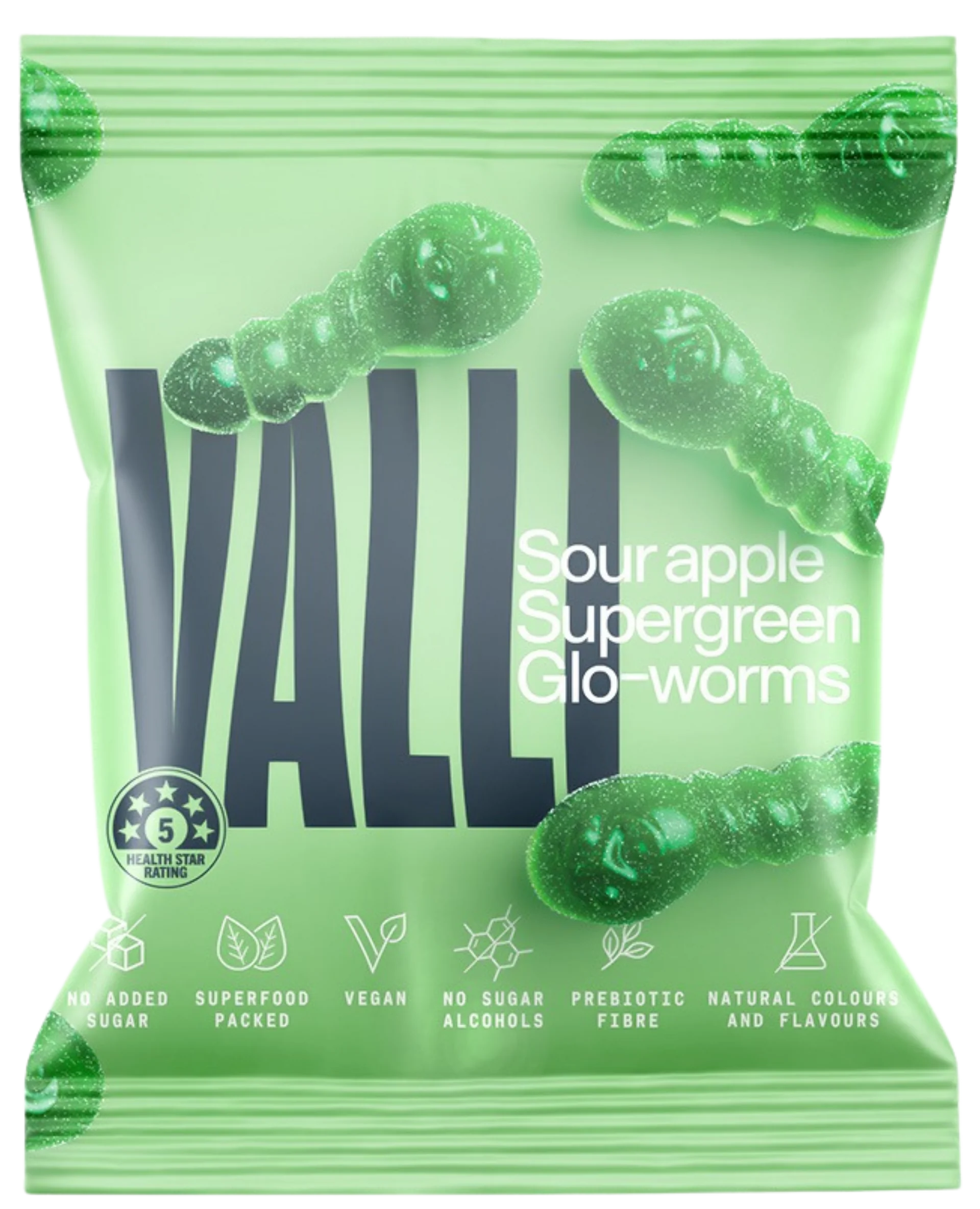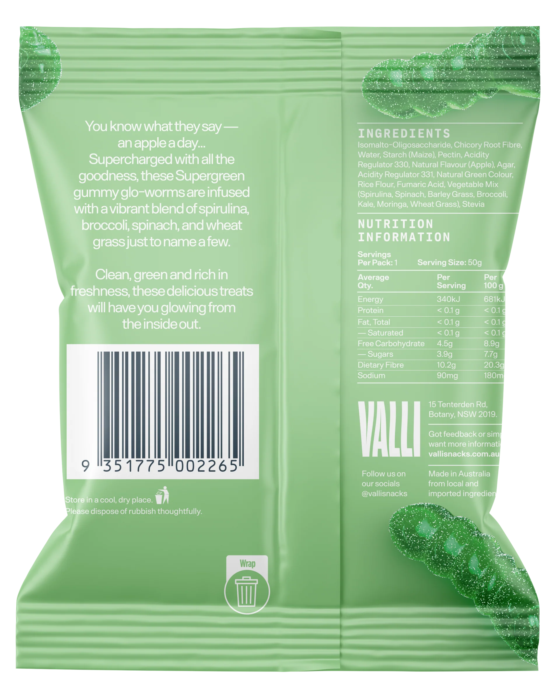 Valli Antioxidant Sour Apple Supergreen Glo-Worms 50g, With Prebiotic Fibre & No Added Sugar