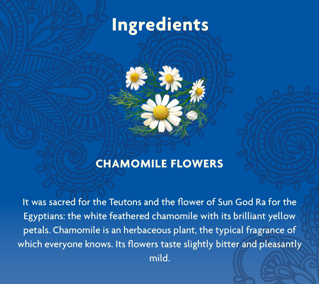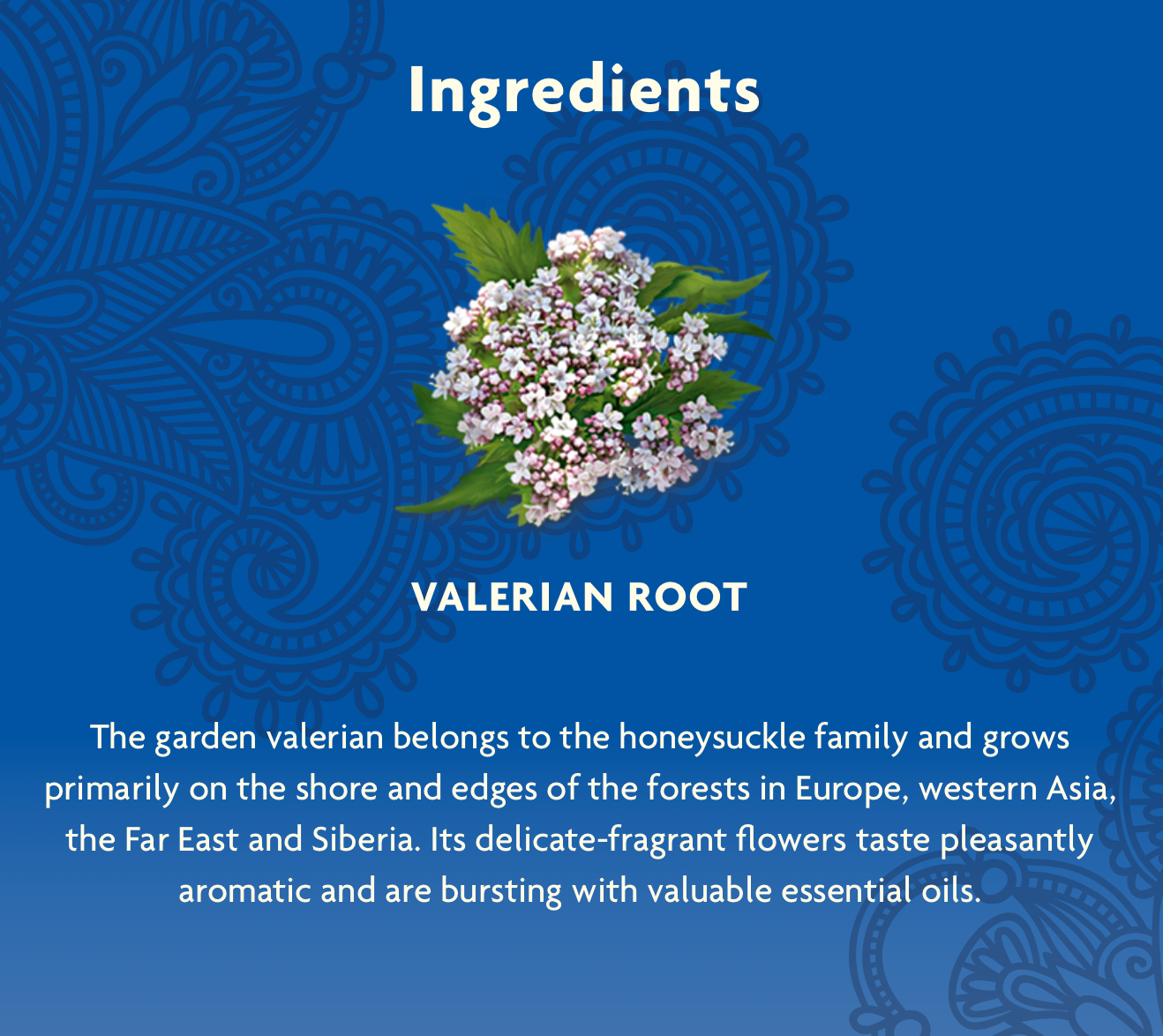 Organic Passion Flower Extract, Organic Valerian Root Extract, Organic Licorice Root, Organic Chamomile Flower, Organic Spearmint Leaf, Organic Skullcap Leaf, Organic Cardamom Seed, Organic Cinnamon Bark, Organic Rose Hip, Organic Lavender Flower, Organic Stevia Leaf, Organic Orange Flavour.