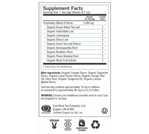 Organic Assam Black Tea Leaf, Organic Yerba Mate Leaf, Organic Lemongrass, Green Tea Leaf Extract, Stevia Leaf, Organic Ashwagandha Root, Organic Tulsi Leaf, Organic Shankpushpi, Ginseng and Eleuthero Root Extracts (Asian Ginseng, American Ginseng and Eleuthero), Natural Orange Flavour, Natural Tangerine Flavour, Natural Lotus Flower Flavour, Organic Orange Peel Oil, Citric Acid, Organic Lemon Myrtle Flavour.